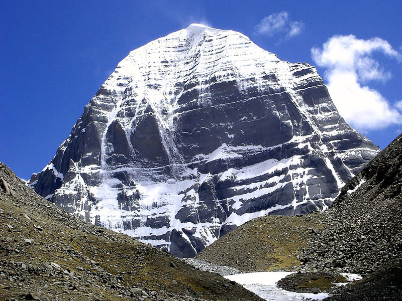 Even before the Himalayas rose into existence, Mount Kailash towered above them. The Kailash Range is 30 million years old and its supreme peak, the 6,675 meter high Mount Kailash was formed of shining granite with its white glacial crest, was already a huge, structure even when the Himalayas were just beginning to protrude out of the Tethys Sea. Hindus and Tibetans seem to have been aware of the uniqueness of this mountain from the most ancient times. To Hindus it is the earthy embodiment of the dominant mountain of heaven, Meru, and the residence of Lord Shiva and his consort Goddess Parvati. To Tibetans it is Sumeru, the cosmic centre of the universe. Consequently Mount Kailash has held a great charm for pilgrims for centuries.