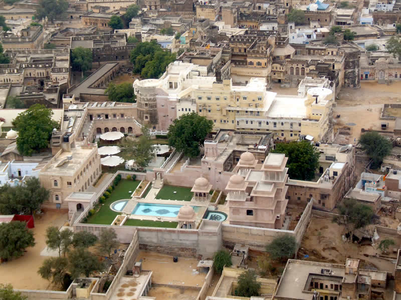 Founded in the mid 18th century Mandawa skyline is dominated by an imposing fort, now a heritage hotel that is maintained in classic medieval style with modern luxuries. The archway is painted with interesting forms of Lord Krishna and his cowherds. The sprawling architecture houses different themes in different wings. The spacious rooms are adorned by intricate interior wall paintings and mirror work with an open terrace that offers a panoramic view of the whole town. A unique collection of well-preserved paintings and antiques adorns the main huge hall in the centre of the castle which was originally the durbar hall and has now been converted to an exotic lounge. The ceremonial costumes of the family collection and the precious arms with handles of jade and beautiful curios brought by the British as gifts for the nobles are also displayed.